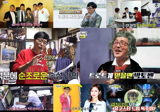 12일 방송된 MBC '놀면 뭐하니?-뽕포유’에선 트로트 가수 ‘유산슬’로 변신한 유재석이 트로트 대가들과 만나 자신의 데뷔곡 ‘합정역 5번 출구’를 탄생시키는 ‘유산슬 데뷔 프로젝트’가 눈 돌릴 틈없이 펼쳐졌다. 허를 찌르는 웃음과 함께 트로트의 묘미까지 완벽하게 담아내며 주말 안방을 사로잡았다.