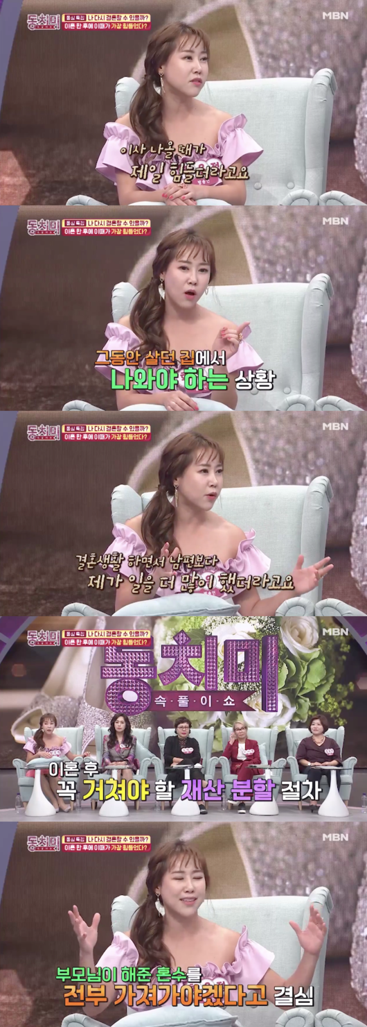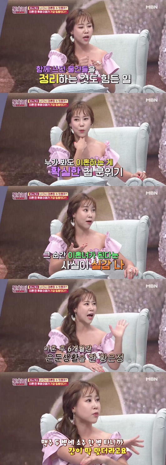 황은정은 “이사 나올 때가 제일 힘들더라. 6년 동안 결혼생활 하면서 남편보다 내가 일을 더 많이 했더라. 아시겠지만 이혼할 때 재산분할을 한다. 오히려 내가 (돈을) 더 줘야 하는 입장이었다”고 했다.