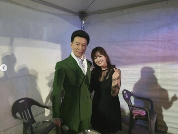 함께 올린 사진에서 정미애는 천막으로 된 대기실에서 트로트 대선배 강진과 함께 다정하게 포즈를 취하고 있다. 강진과 함께 서 있는게 기쁜 듯 손가락으로 하트 포즈까지 취해 보는 이들을 흐뭇하게 만든다.