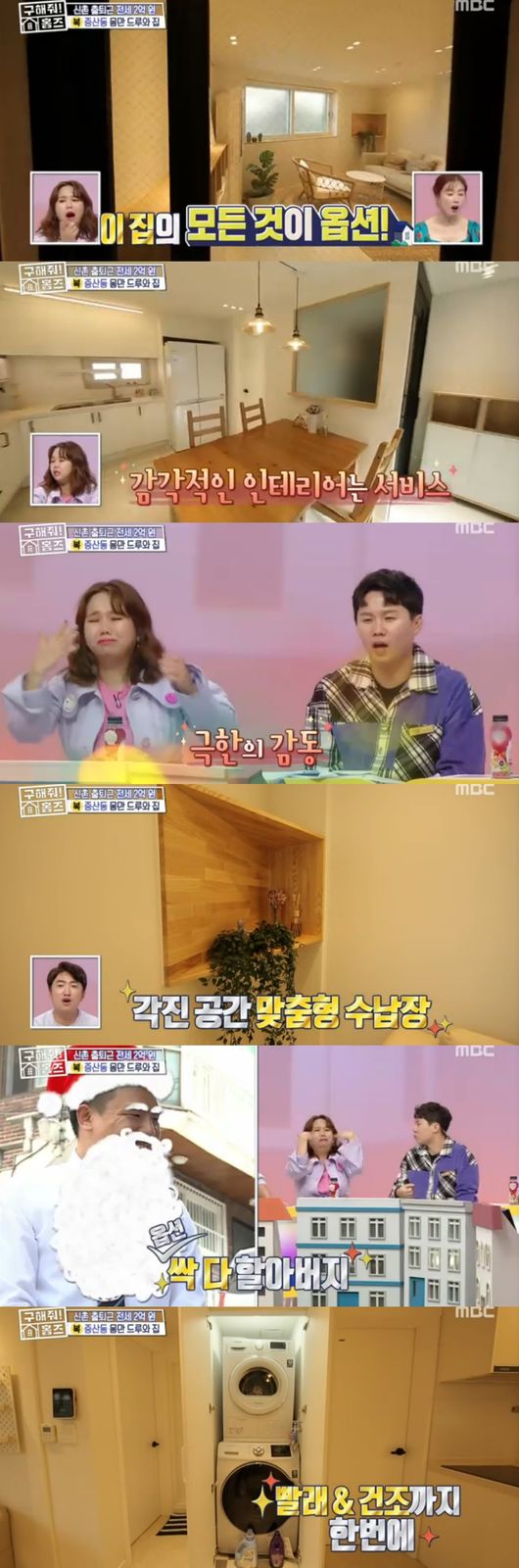 깔끔한 중문을 지나, 안으로 들어섰다. 장동민은 "눈에 보이는 모든 것이 풀옵션"이라면서 모델하우스처럼 가구까지 완비되어 있었다. 장동민은 "이 집의 모든 것이 옵션"이라 말해 모두 놀라게 했다. 양문형 냉장고에 에어컨, 인덕션, 하물며 액자와 조명까지 옵션이었다. 혼수가 필요없는 실속갑 신혼집이었다.