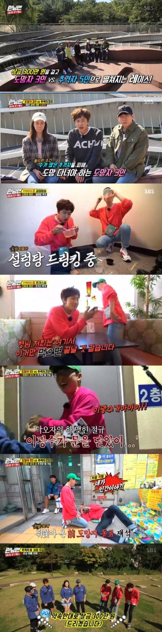 도망자 팀은 첫 미션 ‘김종국처럼 쇼핑몰에서 사인 110장 해주기’는 성공했지만, 두 번째 미션 장소인 김종국 단골 설렁탕집에서 양세찬이 붙잡히며 위기를 맞았다. 하지만 유재석과 이광수는 추격자팀이 양세찬이 집중하는 사이 도망에 성공했고, 마지막 미션 장소로 안양 1번가의 돈가스집을 선택했다.