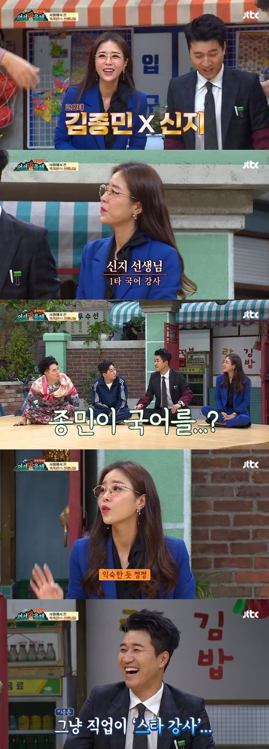 이날 김종민은 첫 등장부터 "내가 대치동에서 국어강사를 하고 있다"라고 말해 웃음을 자아냈다. 이에 신지는 "이 선생님을 가르치고 있는 사람이 나고 그냥 이 분은 직업이 스타강사다"라고 말해 주위를 웃음바다로 만들었다.