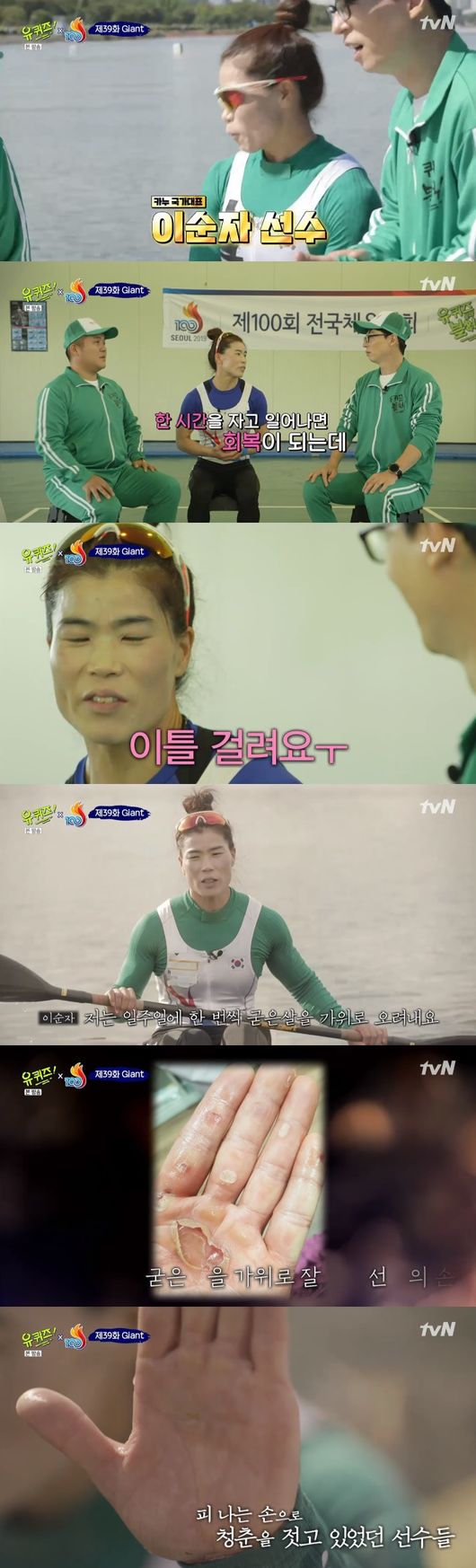 이어 "굳은 살을 일주일에 한번씩 가위로 오려낸다 굳은 살이 쌓이면 노 잡는 느낌이 다르다. 저만 그런 게 아니라 모든 선수들이 그렇다"며 손바닥을 보여줬다. 이후 유재석은 "어떤 노래를 듣냐"고 물었다.