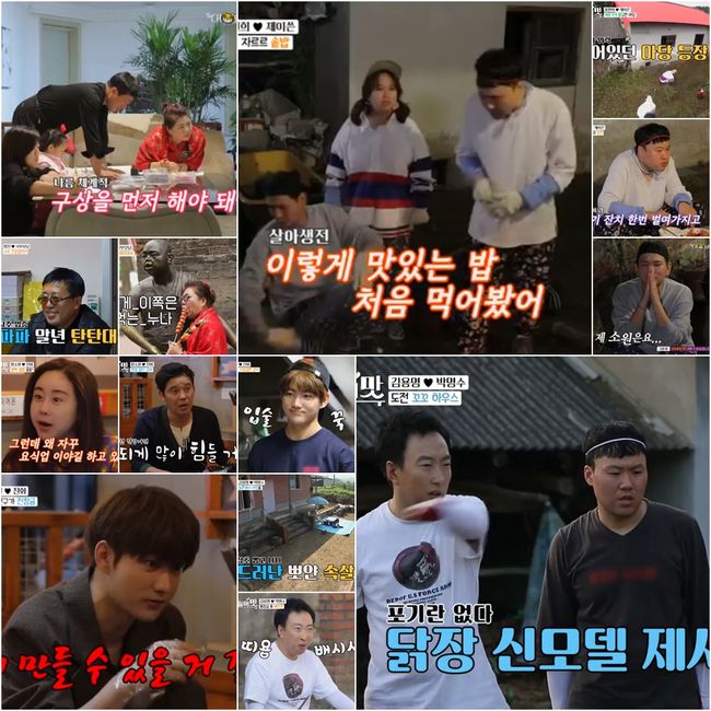 를 따 배추겉절이와 배추전을 뚝딱 만들어 시골밥상을 차렸다. 생전 처음 배추전을 먹어본 박명수는 두 눈이 번쩍 뜨이는 맛에 놀라움을 감추지 못했고, 게 눈 감추듯 순식간에 밥과 반찬을 싹쓸이했다. 식사가 끝나갈 무렵 김용명이 이전에 마을 이장님께 부탁해 놓았던 닭이 도착했고, 닭장 만들기에 돌입한 두 사람은 생각처럼 쉽사리 만들어지지 않는 닭장에 티격태격 케미를 폭발시켰다. 또한 상자에서 기습 탈출한 닭을 잡기 위해 고군분투한 끝에 6시간 만에 두 마리 닭을 닭장에 입주시켰다. /kangsj@osen.co.kr