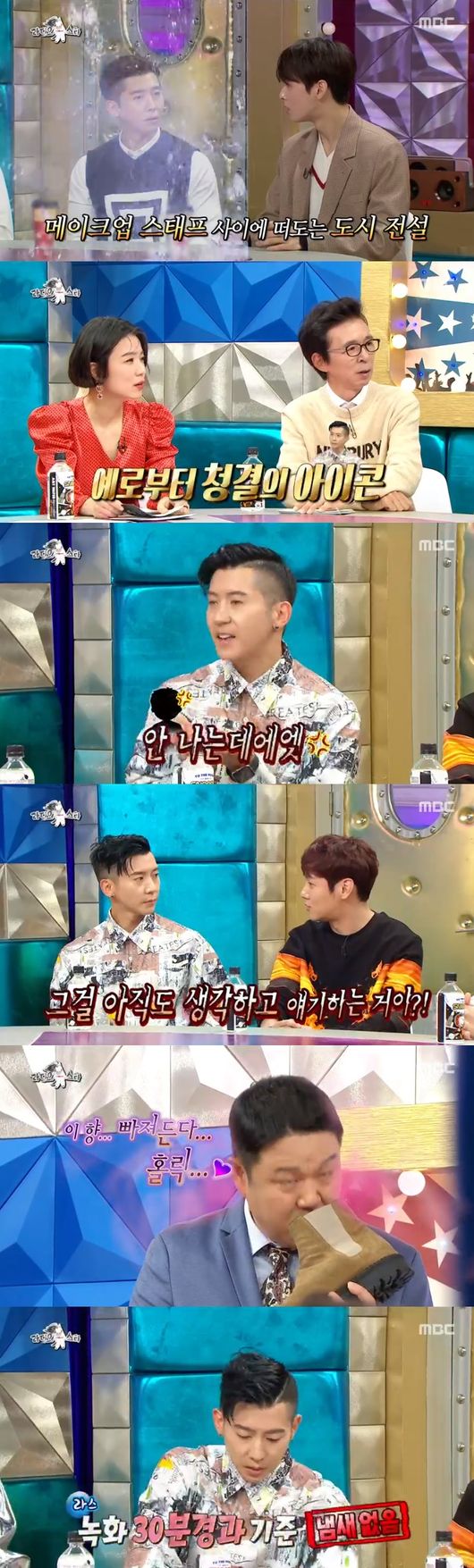 이에 환희는 "아직도 그걸 생각해서 여기 나와 이야기 하는 거냐"며 돌직구를 날려 모두를 폭소케했다. 이어 브라이언은 신발을 벗어 김구라에게 건넸다. 김구라는 "냄새가 잘 나는 신발중 하나다. 그런데 냄새가 나지 않는다"고 전했고 이상엽은 "끝날 때 한번 더 맡아"라고 말해 웃음을 자아냈다.