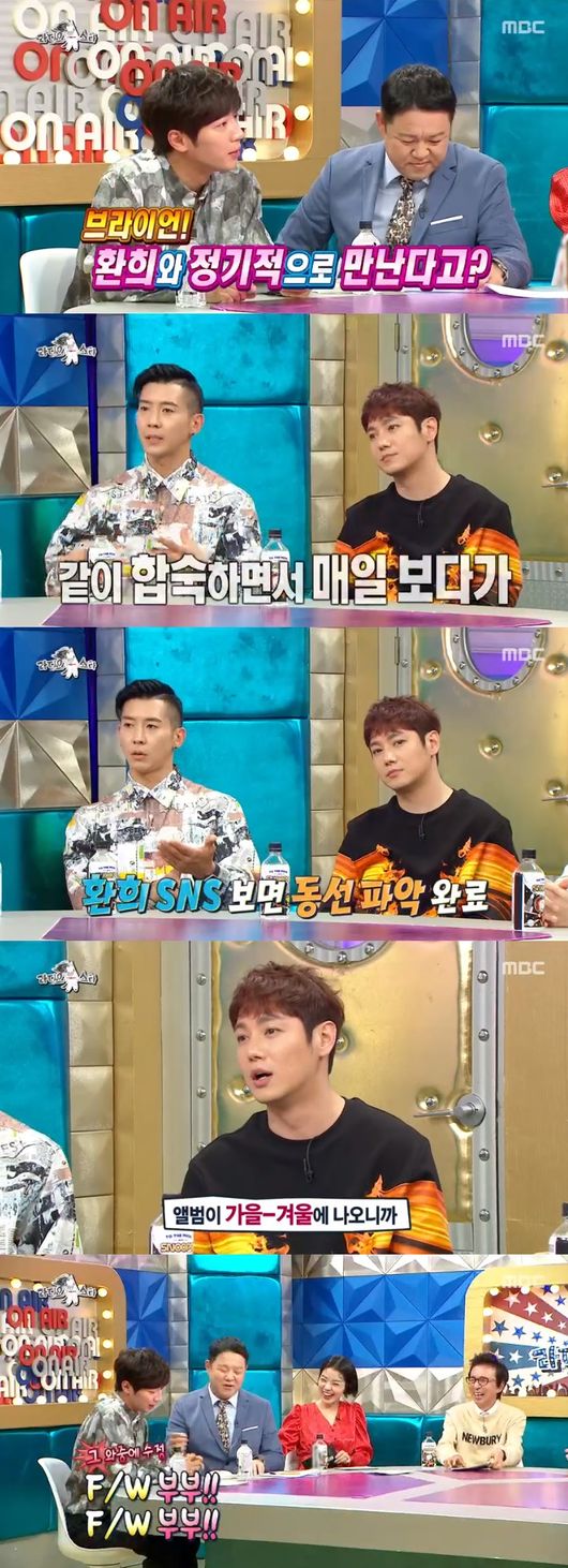 이어 이상엽은 브라이언에게 "정기적으로 환희를 만난다고 하는데"라고 질문했고, 브라이언은 "전에는 숙소 생활해서 자주 봤지만 지금은 정기적으로 정해서 본다. sns를 통해 뭘하고 있는지 알고는 있다"라고 말했다. 이에 환희는 "가을, 겨울에 음반을 만든다. 그때 정기적으로 본다"고 대답했다. 이에 이상엽이 f/w부부라고 애드립을 쳐 웃음을 자아냈다.