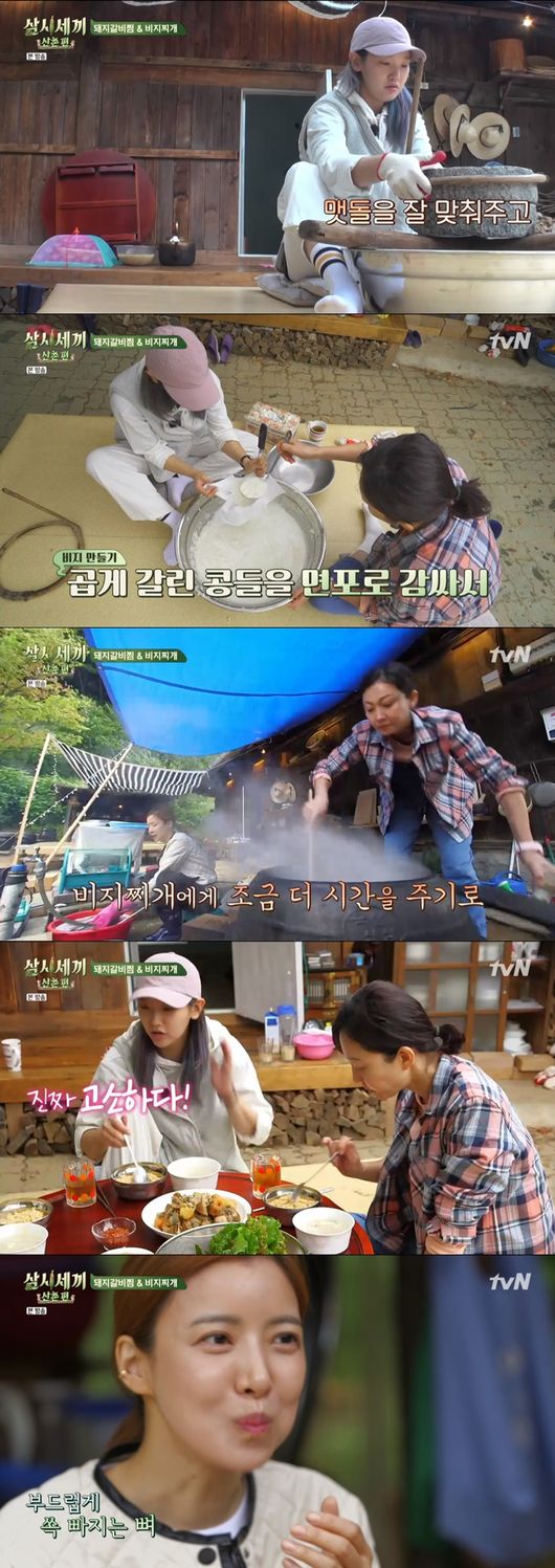 아침 메뉴는 돼지갈비찜과 비지찌개였다. 윤세아가 밭으로 가서 채소를 준비해올 동안 염정아와 박소담은 맷돌을 올려 콩을 갈 준비를 했다. 박소담을 물에 불려둔 콩을 맷돌에 넣고 갈았다. 염정아는 "안 먹어 봐도 맛있을 것 같다"라고 감탄했다.