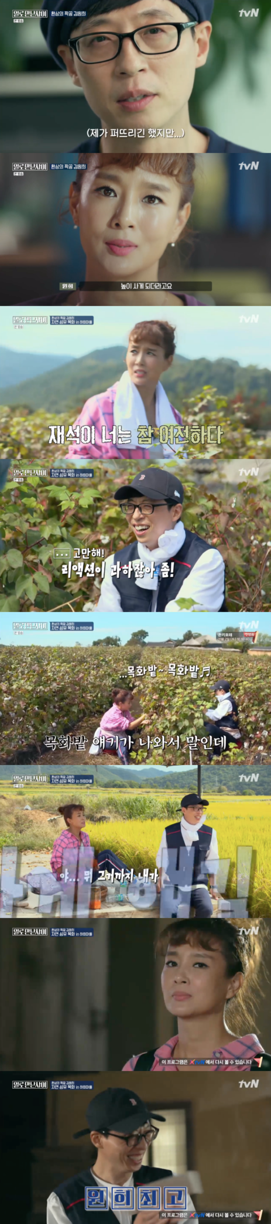 이날 유재석과 김원희는 안도 ㅇ하회마을을 찾아가 목화솜 이불을 만드는 작업을 진행했다. 목화 밭의 잡초를 제거했고, 목화솜을 직접 수확했다. 또 수확한 목화솜에 붙은 이물질을 하나 하나 제거했고, 씨를 제거하는 작업도 했다. 뿐만 아니라 공장에서 넓게 펴낸 목화솜을 이용해 이불을 만드는 작업까지 함께 했다.