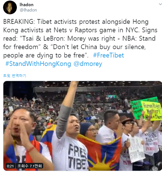 이러한 시위대가 NBA 경기에 모여든 것은 중국이 홍콩 민주화를 지지한 휴스턴 로케츠의 대럴 모리 단장을 압박했기 때문이다.