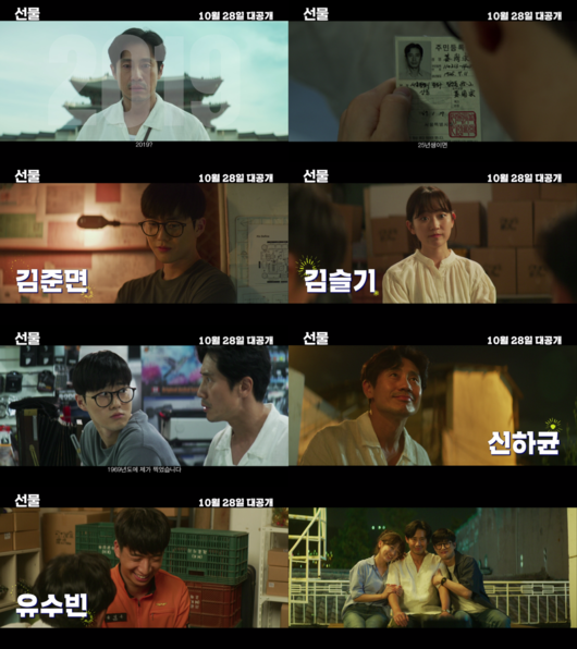 허진호 감독이 선사하는 아주 특별한 영화 ‘선물’이 오는 10월 28일 공개를 확정하고 캐릭터들의 코믹 케미가 돋보이는 30초 예고편을 선보였다. ‘선물’은 반짝이는 아이디어를 실현하기 위해 모인 패기 만렙 청춘들 앞에 과거에서 온 수상한 남자가 나타나면서 벌어지는 이야기를 그린 유쾌 발랄 코미디.