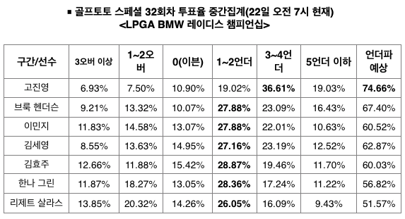 지정 선수별 1라운드 예상 스코어에서는 1번 고진영(36.61%)이 3~4언더파로 가장 높은 수치를 보였고, 나머지 선수들은 모두 1~2언더파가 1순위를 차지해 눈길을 끌었다.