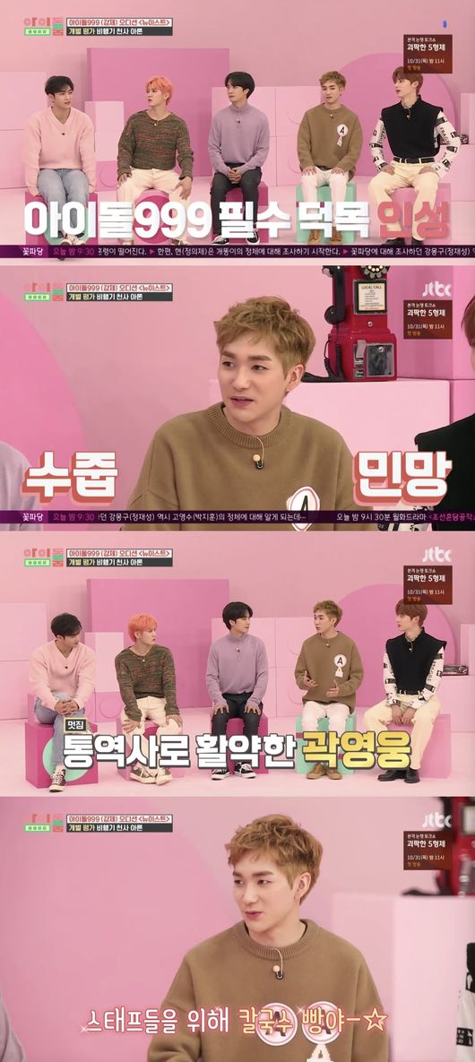 이어 다른 미담은 없냐는 질문에 아론은 "어제 팬미팅 VCR 촬영을 했는데 고생하는 스태프들을 위해 칼국수를 쐈다. 지난주에는 커피를 쐈다"고 밝혀 트리플 A 스티커를 획득했다. /mk3244@osen.co.kr