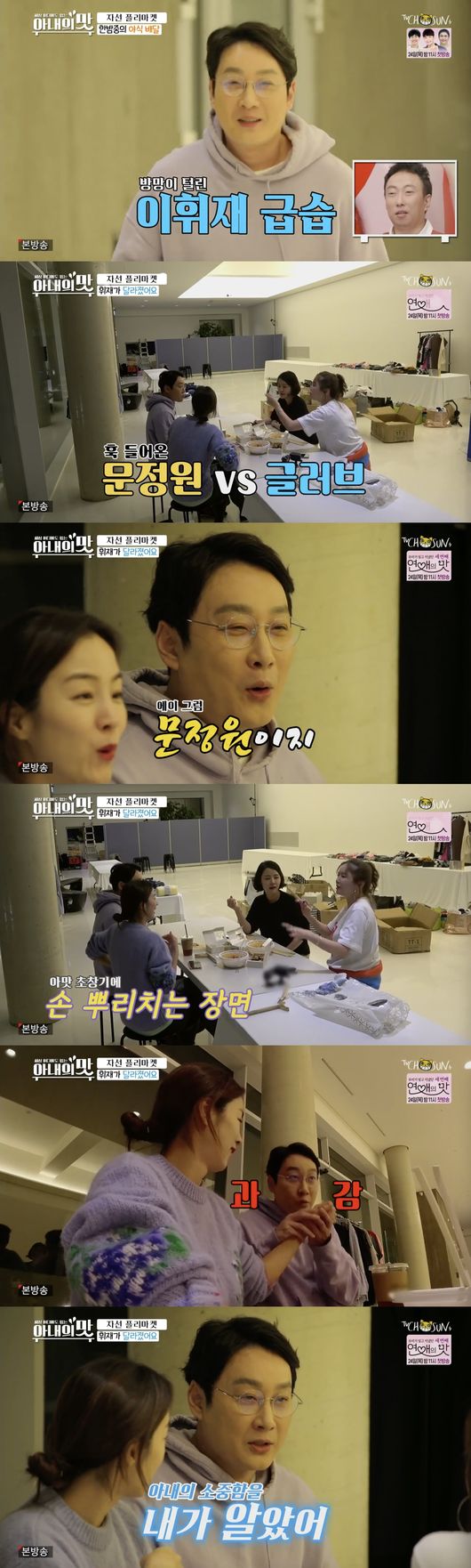 이에 장영란은 "글러브냐 문정원이냐"라며 짓궂은 질문을 했고 이휘재는 망설임 없이 문정원을 택하며 애정을 드러냈다. 이에 문정원은 "원래 글러브를 택했을 텐데 웬일이냐"며 기뻐했다. 이어 장영란은 '아내의 맛' 방송 초반 이휘재가 문정원의 손을 뿌리친 것을 언급했고, 이에 이휘재는 문정원의 손을 잡고 손등에 뽀뽀까지 해 모두를 놀라게 했다. 그는 "아내의 소중함을 알았다"며 완전히 달라진 모습을 보여줬다.