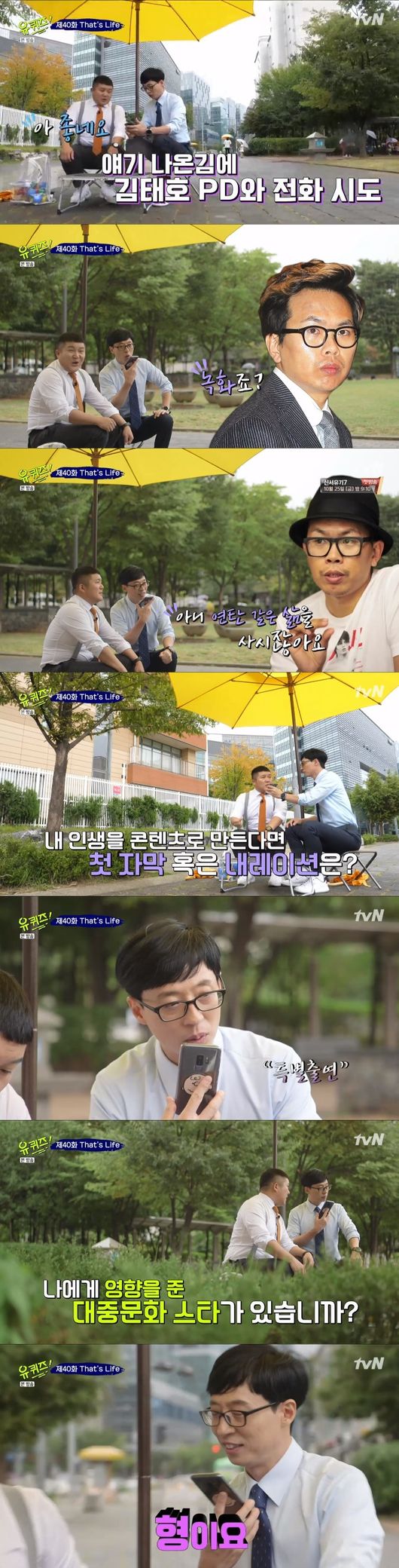 김태호는 피디는 유재석에게 "연탄 같은 삶을 살지 않냐. 성냥처럼 연탄처럼 자신을 태워서"라고 말해 유재석을 감동시켰다. 김태호 피디에게 내 인생을 콘텐츠로 만든다면, 첫 자막이나 내레이션을 뭘로 하겠냐란 질문을 건넸다. 이에 김태호 피디는 "어렵다. 저는 제 인생을 주인공으로 생각해본 적이 없다.그래서 특별출연."이라고 대답했다.