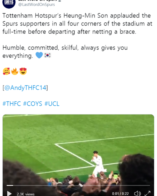 토트넘 팬들은 자신들을 향해 다가온 손흥민의 이름을 연호하며 악수를 요청하거나 하이파이브를 건넸다. 팬들의 환호에 화답하던 손흥민은 최대한 많은 팬들과 스킨십을 즐겼다.