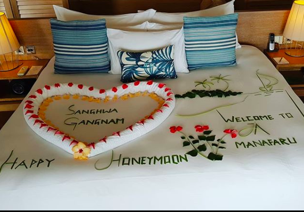뿐만 아니라 강남은 "감동. 너무 이뻐요. 고마워요. 다 너무 잘해주셔서 감동"이라며 예쁘게 꾸며진 침대사진도 올렸다. 이처럼 강남은 이상화와 함께 행복한 신혼여행을 보냈다.