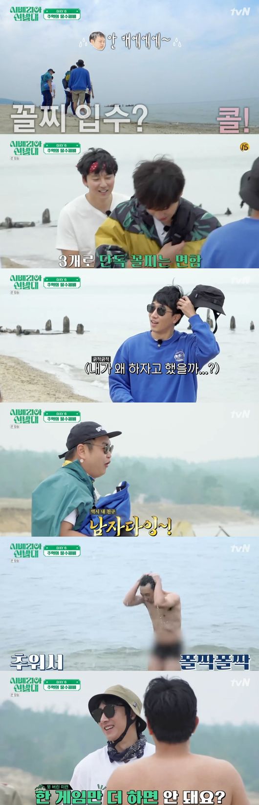 이때, 이상엽이 돌을 던져 물수제비를 만들었다. 갑자기 추억의 물수제비 등장에 경쟁이 붙었다.꼴찌는 입수하기로 했고, 긴장된 모습으로 대결을 펼쳤다. 선균, 남길, 상엽은 3개를 기록, 규필은 8개를 기록했으나 민식이 2개를 기록하며 입수에 당첨됐다.