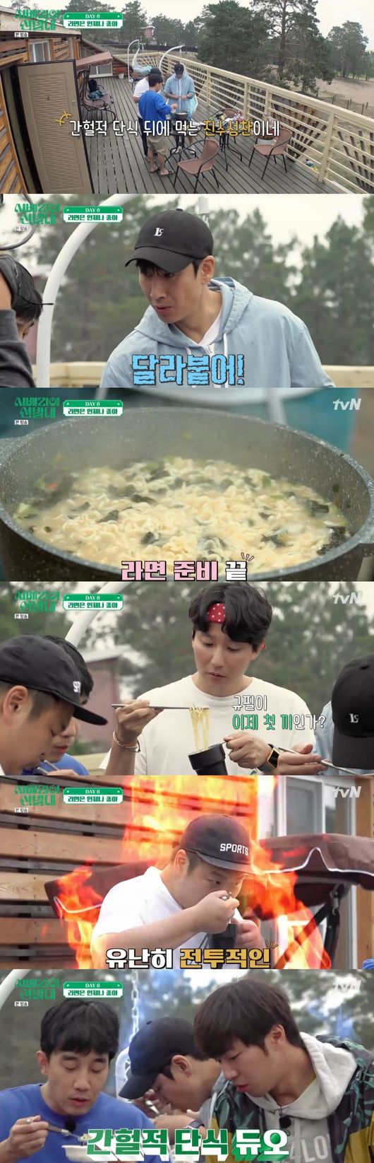 다시 숙소로 돌아왔다. 간헐적단식 후 먹는 진수성찬을 차렸다. 바로 라면이었다. 17시간 공복으로 간헐적 단식인 듀오이선균과 규필은 불붙은 듯 먹방에 빠졌다.