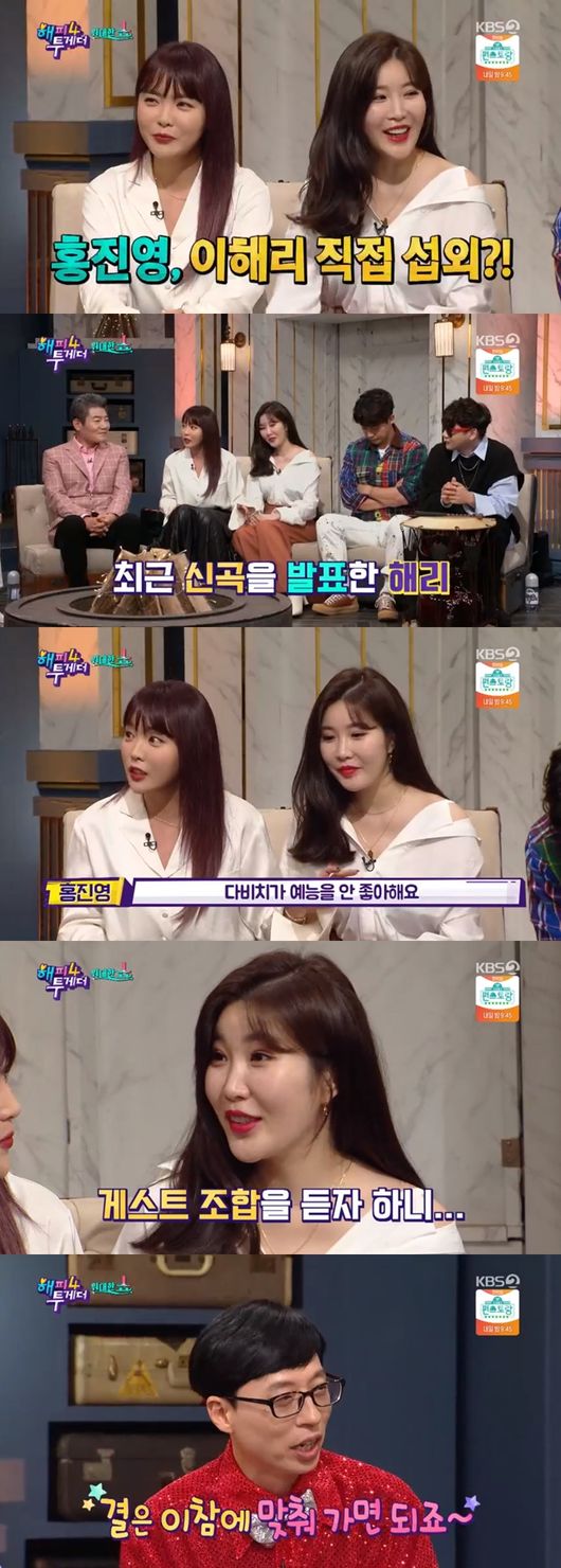 이날 MC김세정은 "홍진영이 열 일하고 계신데 이해리씨를 직접 섭외했다고 하더라"라고 물었다. 이에 홍진영은 "이번에 다비치가 새 앨범이 나왔다. 근데 예능 촬영을 하나도 안하더라. 나 나가는 김에 같이 나가자고 했다. 근데 안 나온다고 엄청 땡깡을 부렸다"라고 말해 웃음을 자아냈다.