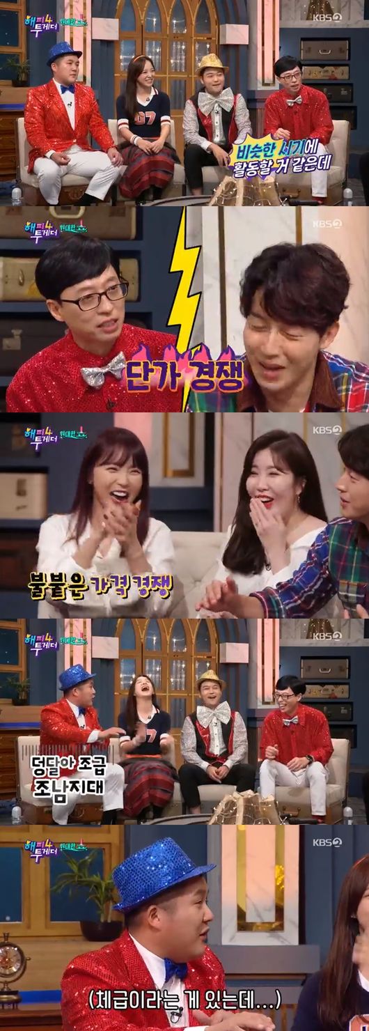 허경환은 유재석을 견제하는 모습을 보이며 "감정이 조금"이라고 말해 웃음을 자아냈다. 이에 유재석은 "같은 시기에 활동 할 것 같은데 자꾸 이러면 단가를 내릴거다"라고 말해 폭소케 했다.