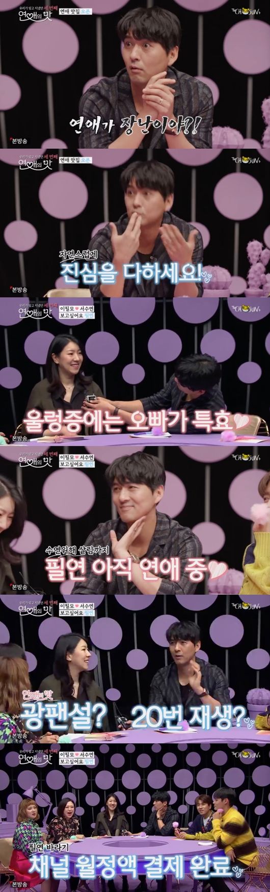 또 서수연은 '연애의 맛'에 자신이 출연한 회차를 많이 돌려본다고. 특히 그는 이필모와의 첫 만남을 자주 본다고 밝혔다. 이에 이필모는 "하도 많이 봐서 정액으로 끊었다"고 덧붙여, 폭소를 안겼다.