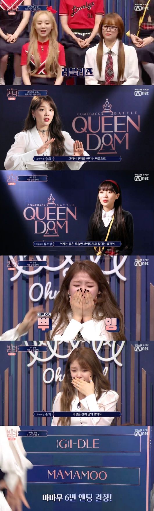 '퀸덤' 오마이걸이 3차 사전 경연에서 1위를 차지했다. 결과를 들은 승희는 눈물을 터트렸다.