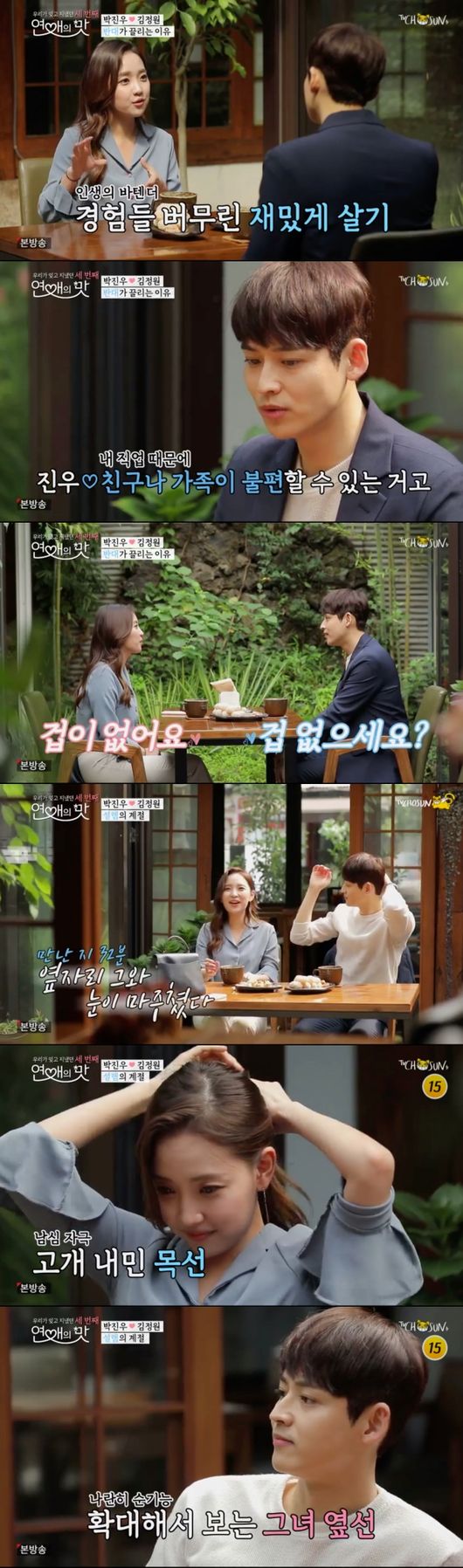 하지만 패널들의 걱정은 엄청난 기우였다. 박진우와 김정원은 박진우의 제안으로 나란히 앉게 됐고, 이 순간을 기점으로 두 사람의 관계는 급진전됐다. 두 사람은 보다 밀착한 상태에서 서로에게 집중하기 시작했다.