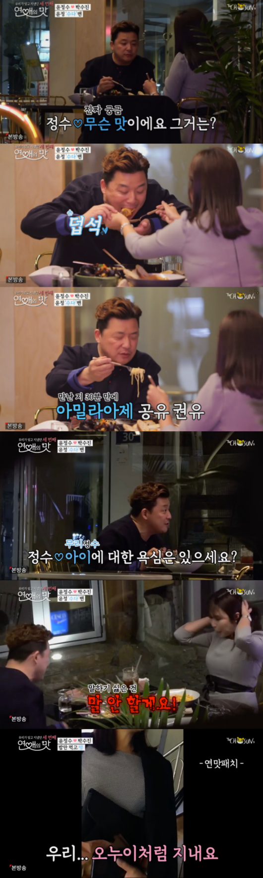 이어 윤정수는 굳이 박수진에게 자신의 파스타를 먹어보라고 권유했다. 그것도 모자라 자신이 쓰던 포크로 파스타를 먹여줬다. 박수진의 표정은 점점 굳어갔다.