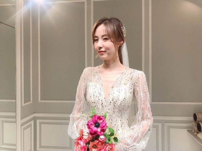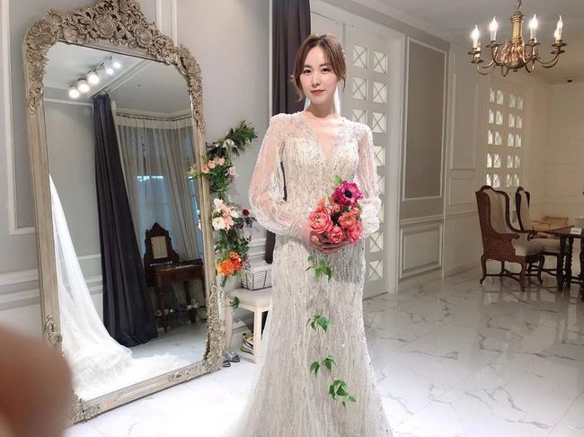 공개된 사진 속에는 화려한 비즈 장식이 돋보이는 웨딩드레스를 입고 포즈를 취하고 있는 간미연의 모습이 담겨 있다. 간미연의 행복한 미소와 아름다운 드레스 자태가 눈길을 사로잡는다.