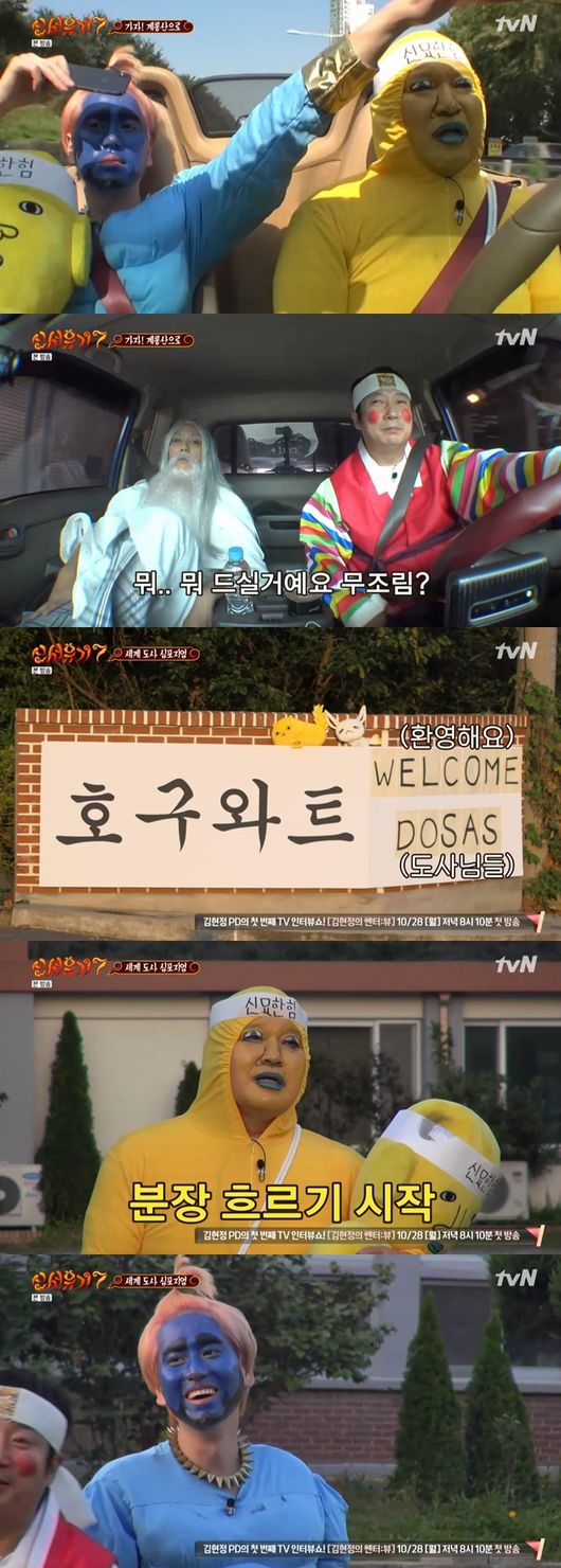 이날 '신서유기' 멤버들은 영험한 신으로 분장했다. 강호동은 신묘한, 조규현은 지니, 민호와 피오는 각각 배추도사, 무도사. 이수근은 무릎팍도사, 은지원은 간달프가 됐다. 강호동과 조규현은 오픈카를 타고 계룡산으로 이동했다.