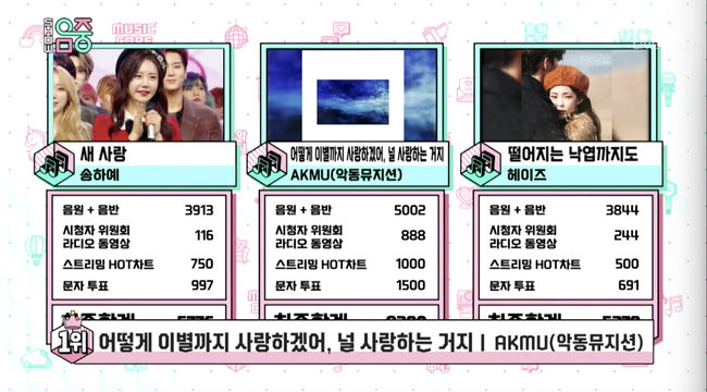 26일 오후 방송된 MBC '쇼! 음악중심'에서는 악동뮤지션과 헤이즈, 송하예가 1위 후보에 오른 가운데 악동뮤지션이 '어떻게 이별까지 사랑하겠어, 널 사랑하는 거지'로 1위를 차지했다.