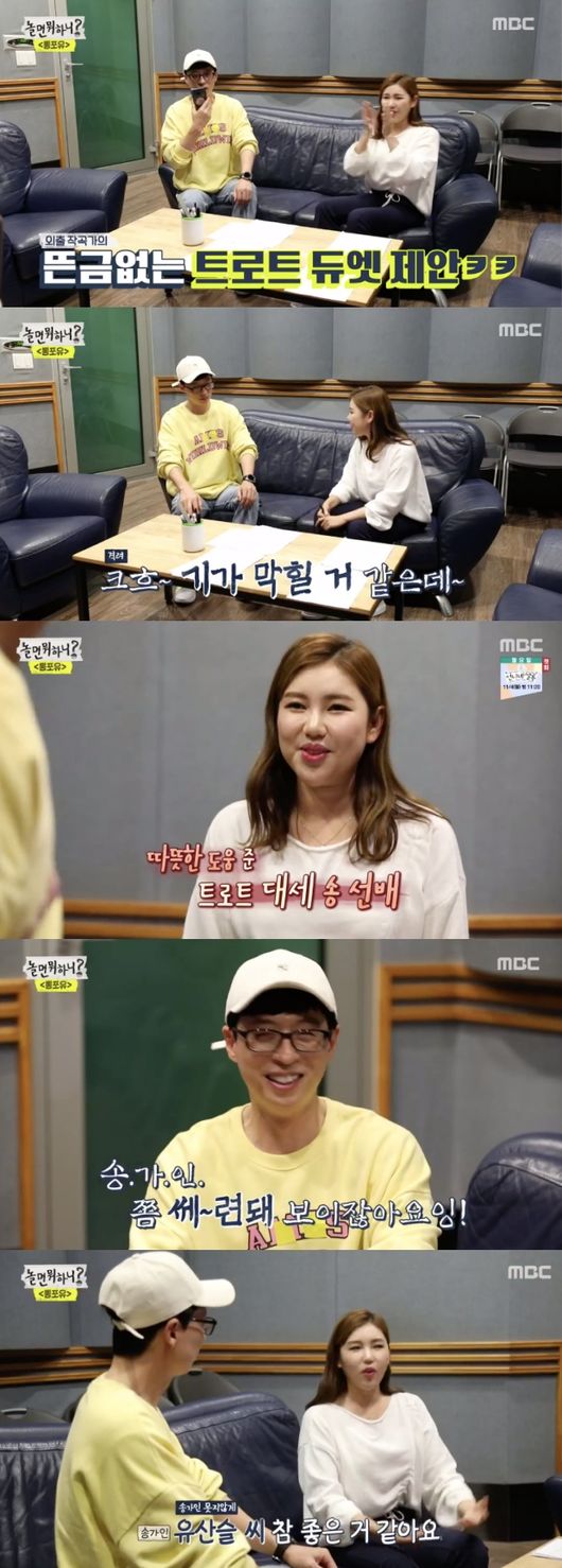 가수 송가인이 방송인 유재석에게 트로트 원 포인트 레슨을 해준 가운데, 듀엣 가능성을 암시했다.