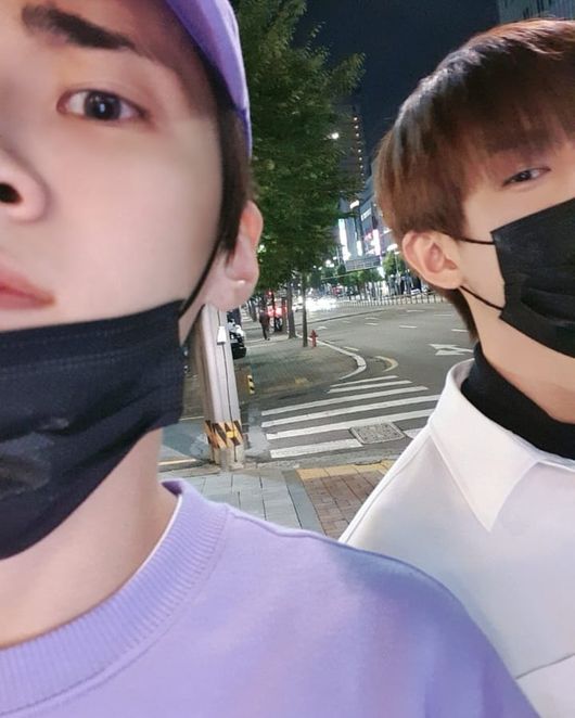사진 속에는 이진혁이 김민규와 사진을 촬영 중인 모습이 담겼다. 연보라색 맨투맨과 모자, 마스크를 쓰고 있는 이진혁과 화이트 셔츠와 마스크를 착용 중인 김민규는 손가락으로 브이(V)를 그리며 사진을 촬영 중이다.