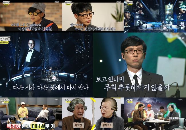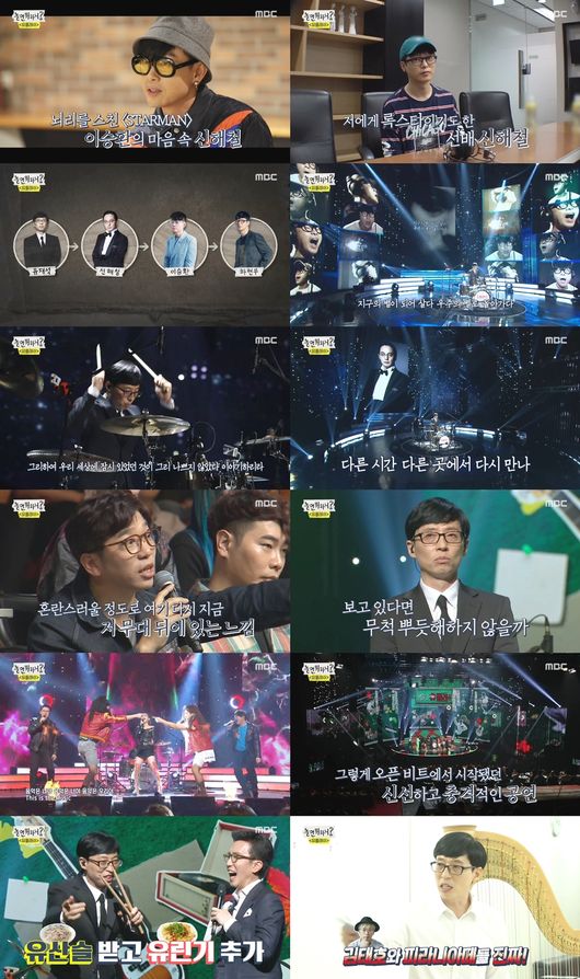 이어 지난 2014년 우리 곁을 떠난 고 신해철과의 가슴 뭉클한 컬래버 무대가 안방을 먹먹하게 만들었다. 유재석의 드럼비트에 신해철의 미발표곡 ‘아버지와 나 파트3’로 추정되는 신해철 내레이션이 더해졌다. 여기에 프로듀싱을 맡은 이승환이 국카스텐의 하현우와 함께 보컬을 더하며 감동의 ’STARMAN' 무대가 완성됐다.