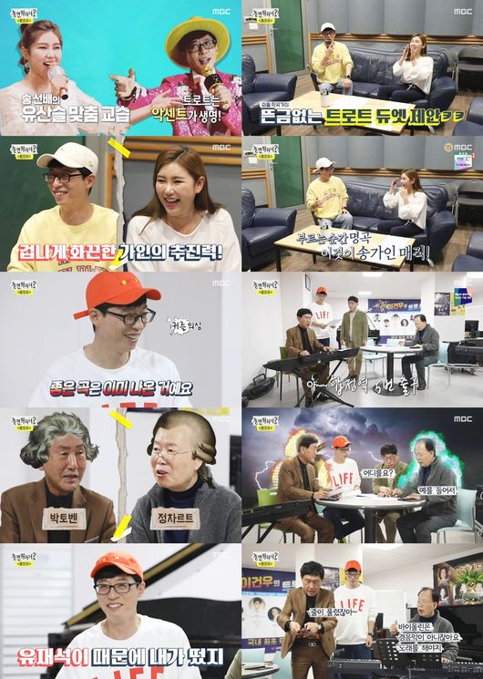 또한 이날 방송에선 유재석과 송가인의 깜짝 만남도 공개됐다. 유재석이 작곡가 윤명선을 찾아간 곳에서 우연히 신곡 녹음을 하러 온 송가인과 마주친 것. 송가인은 ‘합정역 5번 출구’의 데모를 듣고는 감칠맛나는 송가인표 트로트로 선보였다. 또한 유재석을 위해 일대일 트로트 1대 1 포인트 레슨까지 해주며 그의 트로트 여정에 아낌없는 응원을 보냈다.
