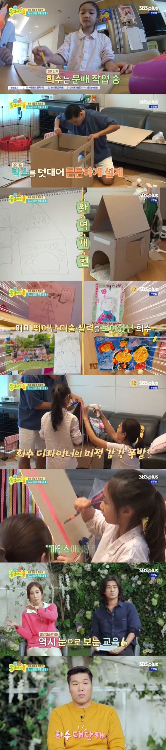27일 오후 방송된 SBS Plus '똥강아지들'에서는 오주은♥문용현의 딸 희수가 애견 하비의 집을 만들면서 미적 감각을 드러냈다.