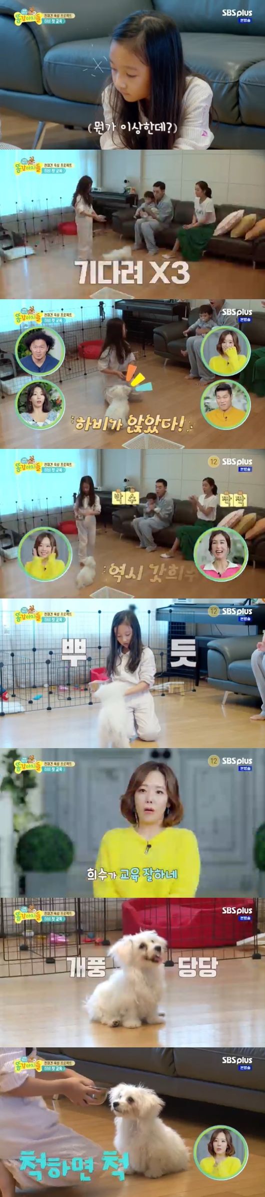 초등학생 딸 희수는 아빠와 엄마가 교육하는 모습을 접한 뒤, 자신만의 스타일로 재도전했다. "기다려 그렇게 안 하던데"라며 하비를 향해 '기다려'라는 단어를 반복적으로 사용했고, '앉아'라고 명령했다. 그러자 하비는 자연스럽게 앉아 소리를 알아 들었다.