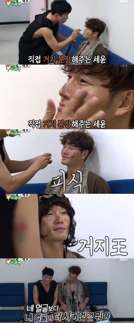 모두의 기대 속에서 리허설이 시작됐다. 유세윤은 직접 김종국의 거지분장을 해줬고, 유세윤이 웃음을 터트렸다. 김종국은 자신의 모습을 거울로 확인하며 "나 런닝맨에서도 이런거 안한다"며 발길질, 완전히 패닉이 된 모습을 보였다. 유세윤은 그런 김종국 모습을 사진에 담기 바빴다. 급기야 "섹시하다"며 김종국 마음을 달랬다.