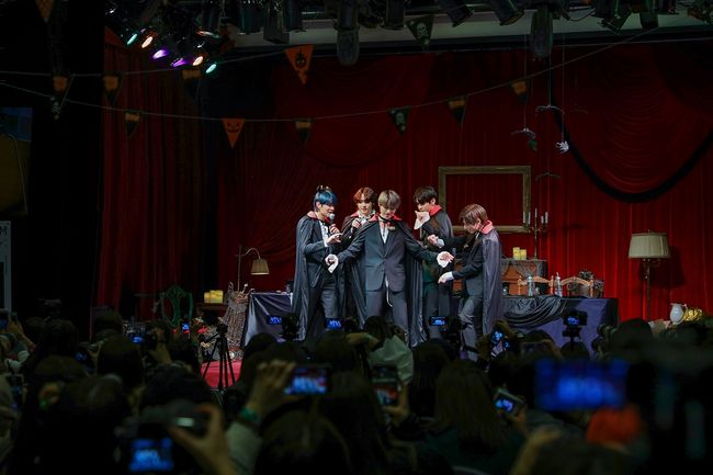 특히, 다가오는 핼러윈을 맞이해 크루즈 전체가 핼러윈 콘셉트로 꾸며져 현장을 찾은 팬들에게 색다른 즐거움을 안겼다. 다섯 멤버는 이에 어울리는 개성 있는 슈트와 검은 망토를 두르고 등장해 모아(MOA)들의 폭발적인 반응을 얻었다.