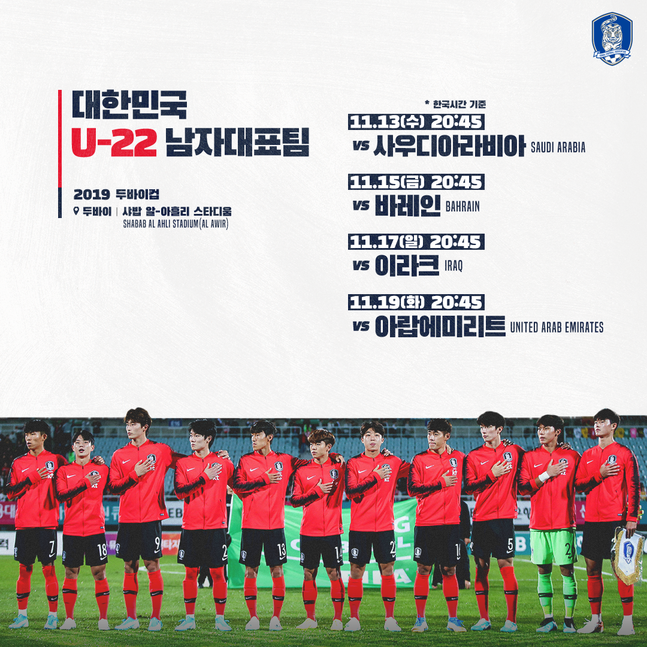 김학범 감독이 이끄는 남자 U-22 대표팀이 오는 11월 UAE에서 열리는 ‘2019 두바이컵’ 친선대회에 참가한다.
