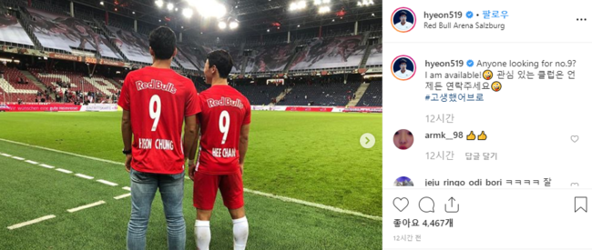사진을 게재한 정현은 "9번 찾는 팀 없어요? 관심 있는 클럽은 언제든 연락주세요"라는 장난끼 넘치는 멘트와 함께 해쉬태그로 '힘내 브로'란 말로 낙담할 수 있는 황희찬을 격려했다.