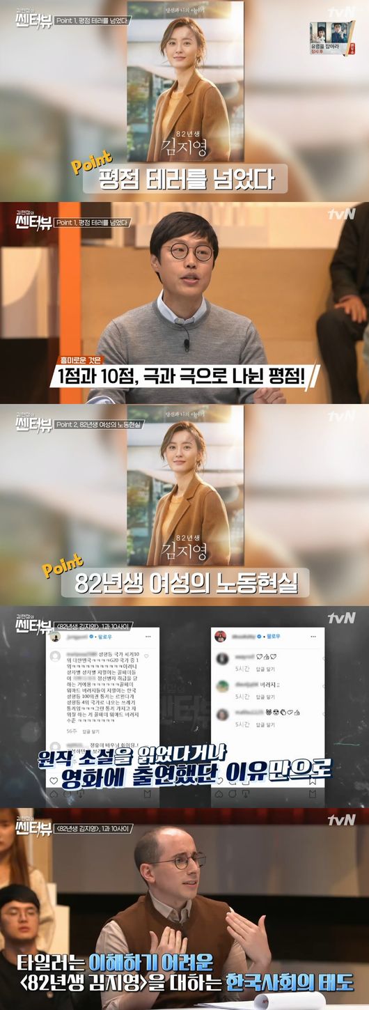 '김현정의 쎈터:뷰'가 시작된 가운데 김준일 기자와 타일러가 출연했다. 바로 백인의 해시태그로 본 이주의 이슈에 대해 알아봤고 방청객들은 다양한 해시태그 중에서 '82년생 김지영'을 꼽았다. 팩트체커 김준일 기자 역시 손목보호대를 보이면서 영화 '82년생 김지영'을 원픽으로 꼽았다.