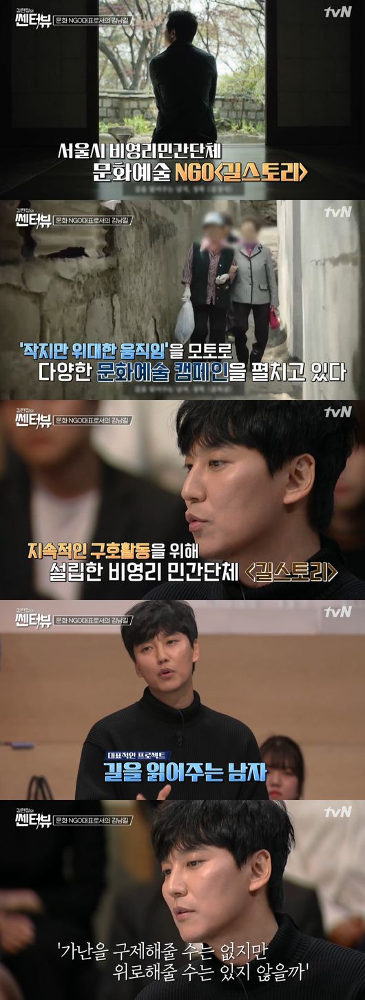 대표적인 프로젝트는 '길을 읽어주느 남자'에 대해 김남길은 "길을 걸으며 느끼는 다양한 정서 ,함께 사는 사회에 대해 접근하기 시작했다, 시대가 바뀌어도 잊지 말고 나누자는 취지였다"면서 "가난을 구제해줄 수 없지만 위로해줄 수 있지 않을까 생각했다"고 덧붙였다.
