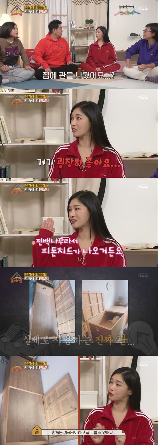 배우 선우선이 '옥문아'에 출연, 집 안에 관을 놓고 들어가서 생활하는 일상을 공개했다.