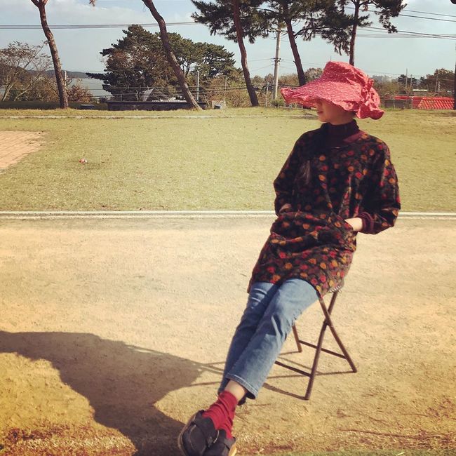공개된 사진 속 공효진은 '동백꽃 필 무렵' 촬영 현장으로 보이는 곳에서 휴식을 취하는 모습이다. 이때 공효진의 평범하지 않은 패션이 눈길을 끈다. 공효진은 붉은색 프릴 모자로 햇빛을 가리고, 장미 패턴의 갈색 벨벳 롱 티셔츠를 착용했다. 검은색 스웨이드 로퍼 신은 빨간색 양말도 독특하다. 과연 극 중 옹산의 대표 미녀다운 패션이다.