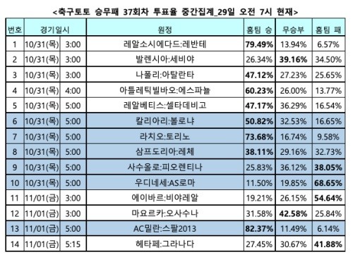 라리가 및 세리에A 14경기 대상 축구토토 승무패 37회차 투표율 중간집계 결과