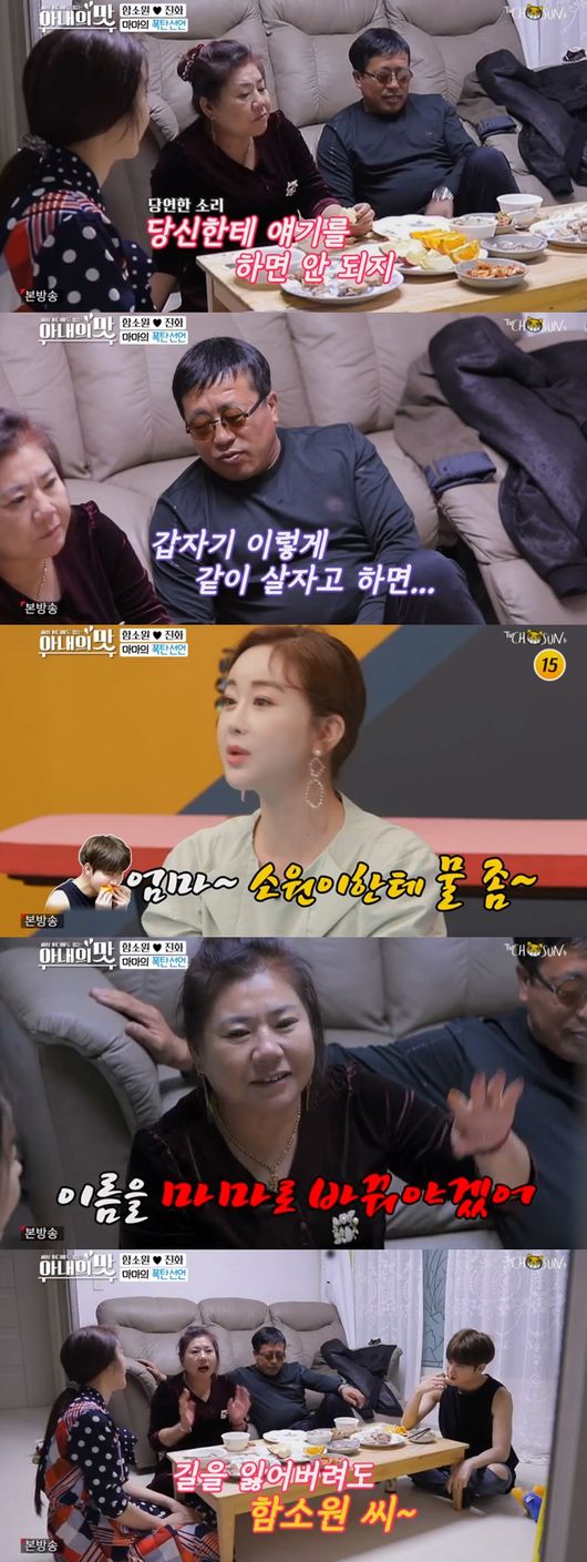 진화의 어머니는 함진부부의 눈치를 보다가 "너희랑 같이 살고 싶다"고 합가를 선언해 주위를 깜짝 놀라게 만들었다. 함소원은 패널들에게 "남편과 어머님과 함께 있으면 어떤 일이 생기는 줄 아나. 남편에게 물 좀 갖다달라고 하면 남편이 어머님께 소원이에게 물 좀 갖다주라고 한다"라고 말해 주위를 웃음바다로 만들었다.