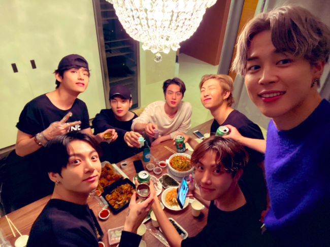 사진 속에서 방탄소년단 멤버들은 편안한 옷차림을 하고 다 함께 테이블에 둘러 앉아 함께 투어 뒤풀이를 즐기고 있는 모습이다.