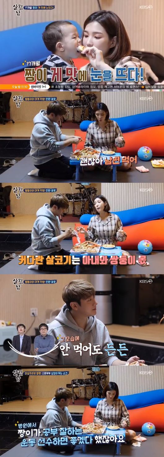 민환은 능숙하게 대게를 손질한 후 찜기에 넣었다. 민환은 잘 쪄진 대게를 잘라 짱이를 먹였다. 짱이는 맛있게 게 맛을 즐겨 눈길을 끌었다. 민환은 살을 발라 아내 율희에게 먹여줬고 그 모습을 흐뭇하게 바라봤다.