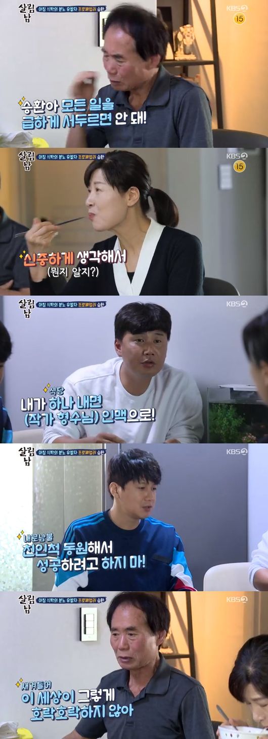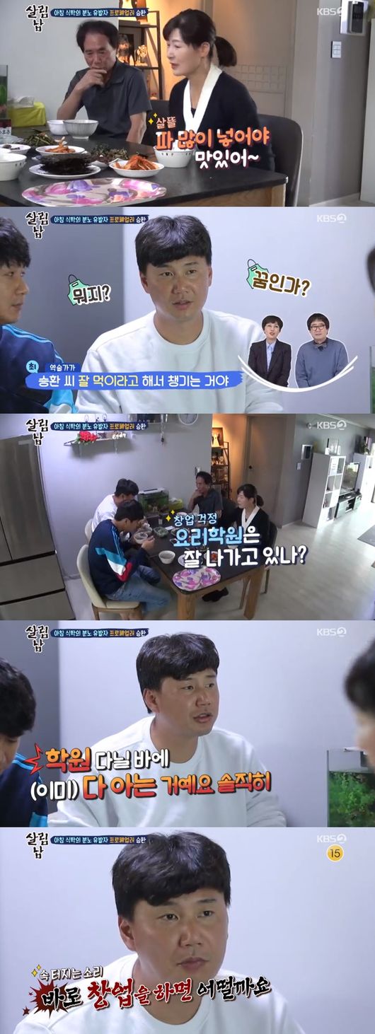 김승환은 "지금 시기가 적절하다. 창업하고 형수님한테 이야기 해서 방송에도 한 번씩 나오면 얼마나 좋냐"라고 말했다. 이에 김승현은 "친인척관계를 이용하면 안된다. 네가 힘들다고 하면 나중에 도와주겠다"라고 말했다. 하지만 김승환은 "내가 가게를 많이 해서 괜찮다"라고 고집을 부렸다. 김승현의 아버지는 "네가 돈이 어딨냐"며 "뭔가를 해보고 싶으면 큰 집에 가서 3년 만 버텨봐라"라고 조언했다.